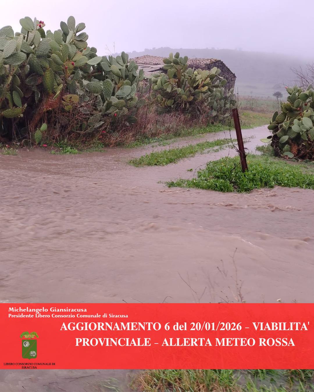 Libero Consorzio Comunale di Siracusa In aggiunta ai precedenti aggiornamento si segnala che • la S.P. 32 Carlentini - Pedagaggi risulta pericolosa ed impraticabile per l'eccessivo afflusso di acqua in carreggiata; la pattuglia della Protezione Civile Provinciale con Siracusa Risorse stanno operando per interdire il transito; • la S.P. 54. Sortino - Fiumara - Mandredonne nel tratto che va dall'Ex Stazione di Sortino Fusco ai giardini di C.da America è assolutamente esclusa al traffico per la probabile ed imminente esondazione del Fiume Anapo in corrispondenza del guado; la protezione civile di Sortino si sta attivando per la chiusura da entrambi i lati del fiume. Permangono necessarie attività di verifica, anche con il supporto della Protezione Civile.