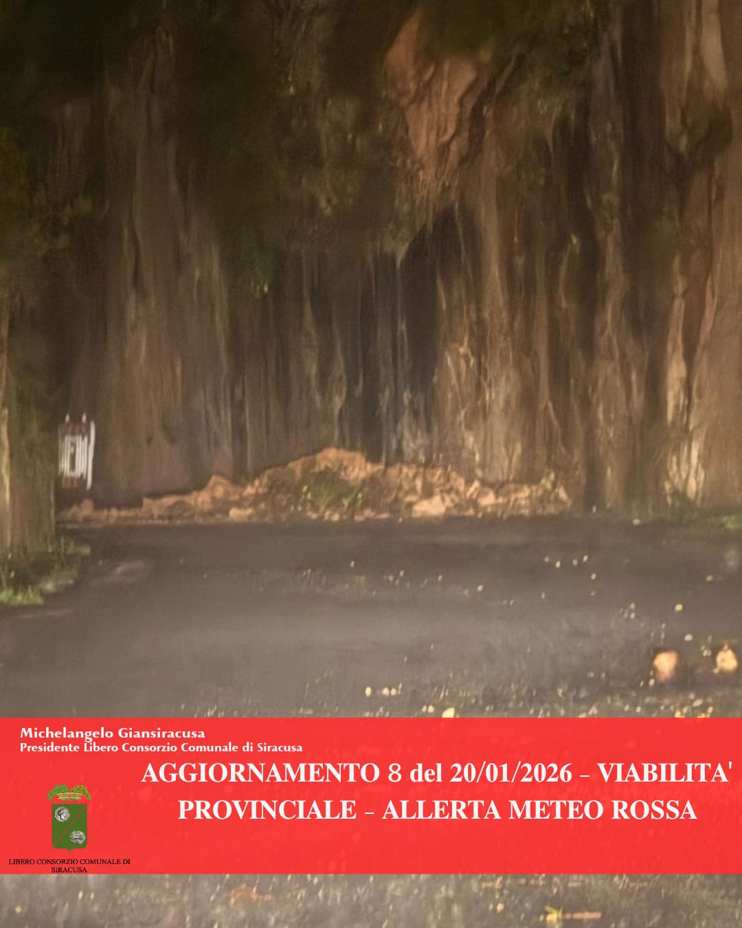 Libero Consorzio Comunale di Siracusa A causa del peggioramento delle condizioni di una porzione di parete rocciosa, già oggetto di alcuni distacchi odierni, stiamo chiudendo al traffico la SP 40, accesso Stazione Cassaro-Ferla, nel tratto compreso dal bivio Cassaro–Ferla fino all’ingresso della Valle dell’Anapo. In via precauzionale anche la SP39 Buscemi sud è interdetta al traffico. Inoltre, si segnalano: - sulla SP 28 Solarino - Fusco - Sortino la caduta di un grosso albero che limita la circolazione; - una frana sulla SP 10 Cassaro-Ferla all’altezza del secondo tornante che limita fortemente il transito.